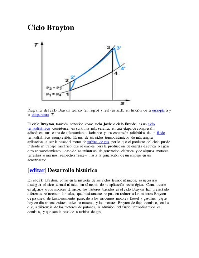 La eficiencia térmica η th representa la fracción de calor Q H que se convierte en trabajo. En este objeto de aprendizaje se presentan dos modificaciones que se realizan al ciclo de Brayton de. Los procesos 1-2 y.